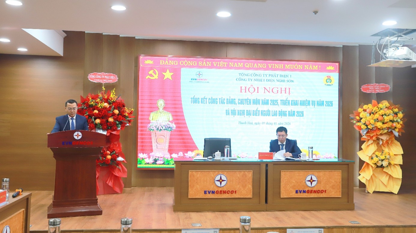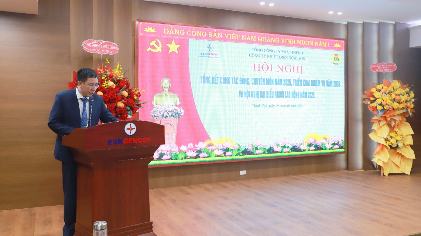 Phát biểu chỉ đạo tại Hội nghị, ông Lê Hải Đăng – Phó Bí thư Đảng uỷ, Thành viên HĐTV, Tổng Giám đốc Tổng công ty Phát điện 1 ghi nhận và đánh giá cao những nỗ lực, kết quả mà Công ty Nhiệt điện Nghi Sơn đã đạt được trong năm 2025. Lãnh đạo Tổng công ty đề nghị Công ty tiếp tục phát huy tinh thần đoàn kết, kỷ cương; nâng cao chất lượng công tác xây dựng Đảng gắn với nhiệm vụ chuyên môn; chú trọng quản trị rủi ro, an toàn – môi trường và chăm lo đời sống người lao động; chủ động triển khai các giải pháp nhằm hoàn thành tốt nhiệm vụ sản xuất – kinh doanh năm 2026, góp phần bảo đảm cung ứng điện an toàn, ổn định cho phát triển kinh tế – xã hội.